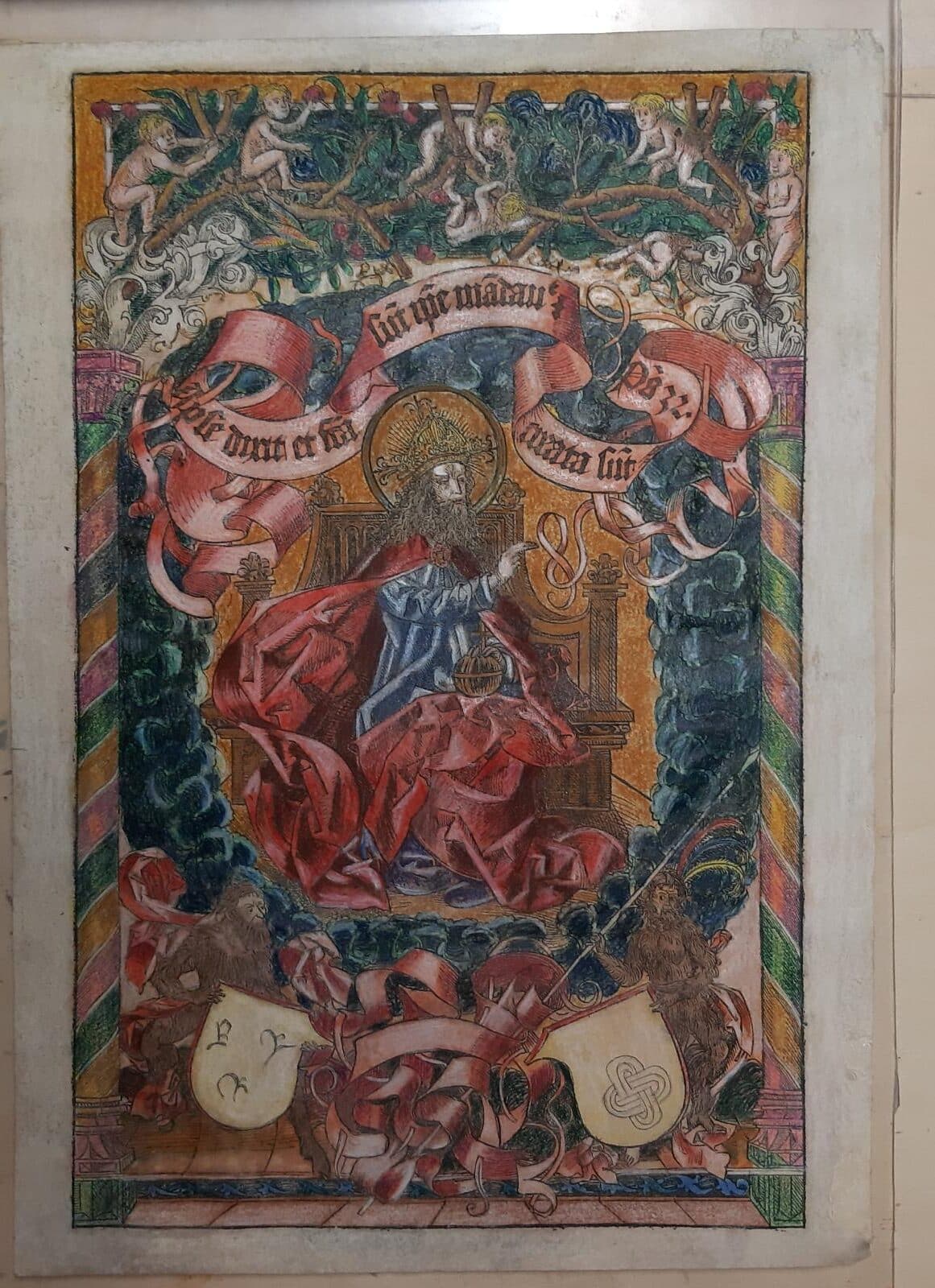 - Grabado que forma parte del libro ” Crónicas de Nuremberg” impreso en 1493. Narra la historia universal basándose en el relato de la Biblia; además es conocido por sus numerosos grabados de ciudades de la época y por contener uno de los primeros mapas de Alemania impresos. Se sabe que las figuras superiores del grabado están realizadas por Alberto Durero.