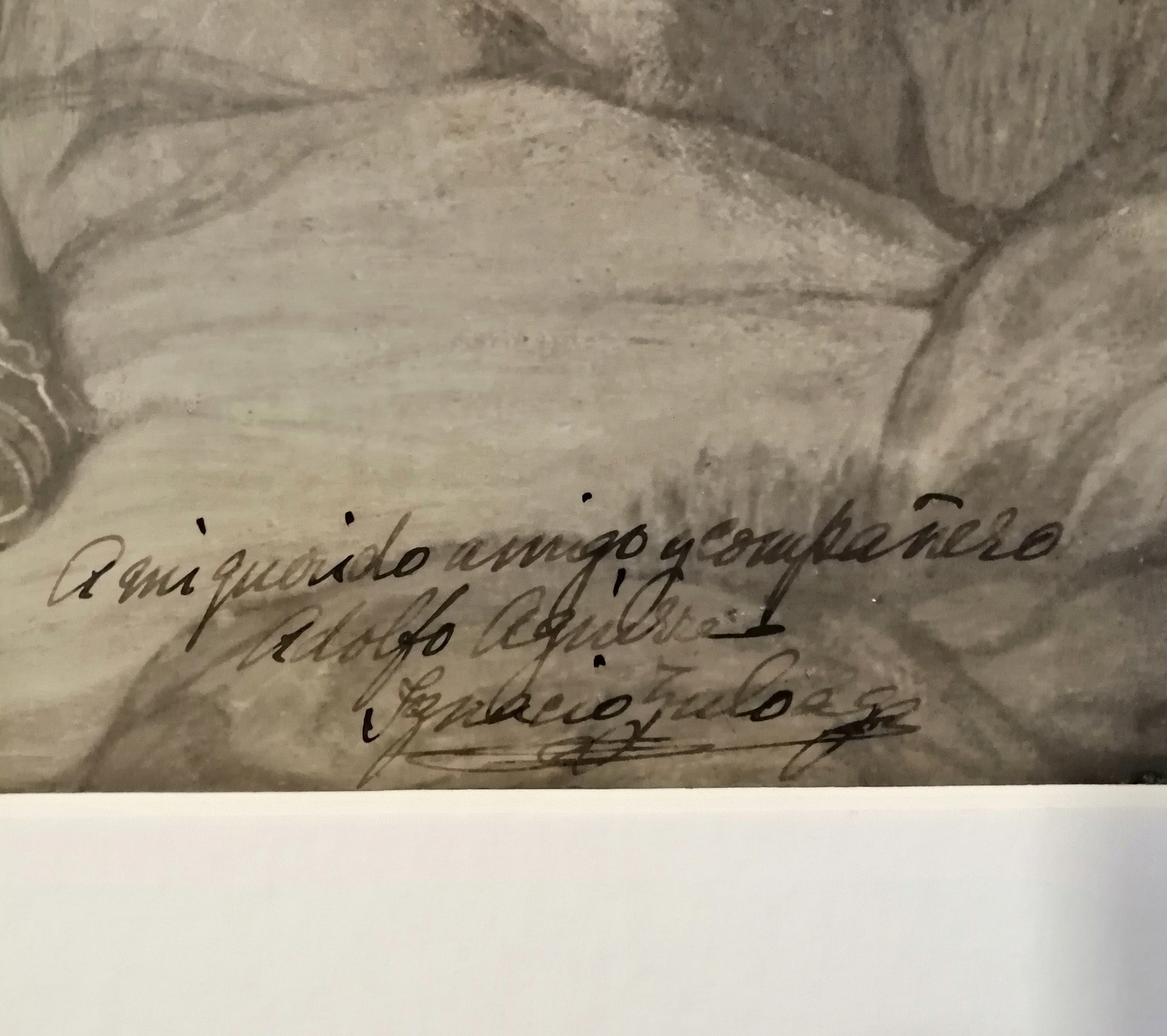 • La pieza es un regalo dedicado ,dirigido a Adolfo Aguirre, uno de los dos arquitectos encargados de la ejecución de un monumento conmemorativo a Elcano con motivo del IV Centenario de la Vuelta al Mundo; su interés reside en que esta foto sería la primera vez que la obra sería mostrada antes de su presentación oficial en 1922.