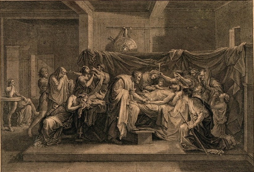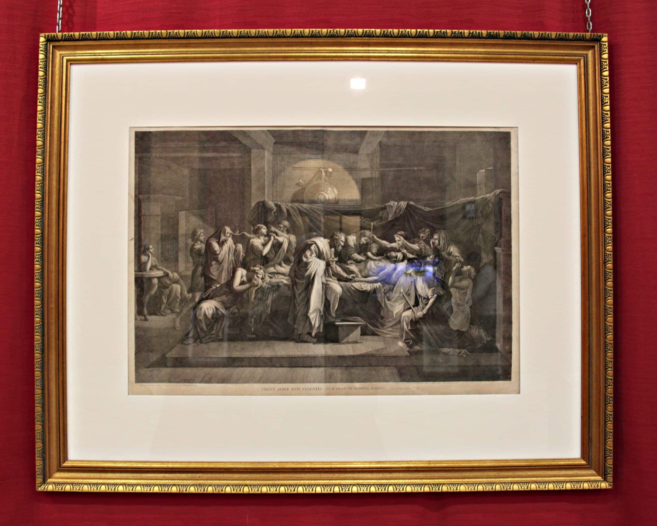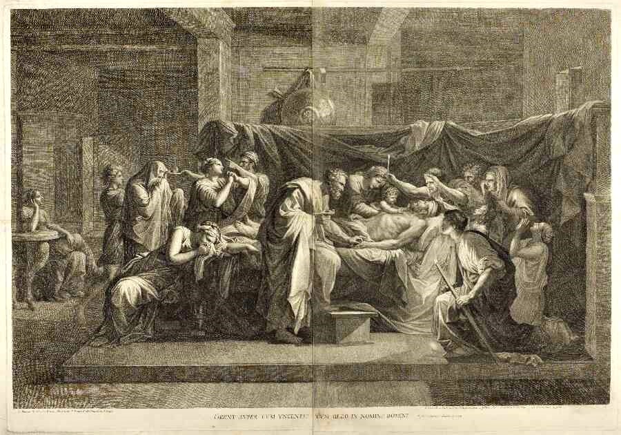 • Interesantísima y espectacular obra, que forma parte de un grupo de grabados en dos placas sobre las pinturas de la famosa serie de los Siete Sacramentos del genial pintor Nicolás Poussin. Este, sobre el sacramento de la extremaunción, está basado en un modelo compositivo realizado, previamente, por Gavin Hamilton en la primera de su ciclo de seis pinturas homéricas, concretamente la de Andrómaca llorando la muerte del troyano Héctor, y que sirvió de inspiración a Poussin adaptándola a sus necesidades. Este grabado es una versión del óleo original del extraordinario pintor y llevado al buril por Jean Pesne. Forma parte, un ejemplar idéntico al nuestro, del préstamo Sutherland a la Galería Nacional de Escocia y del Museo del Louvre en Paris.